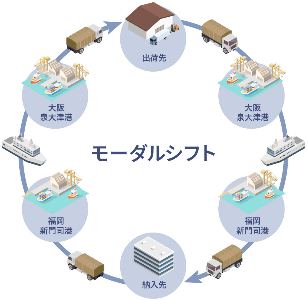 環境負荷・エネルギー効率を踏まえてトラックなどの輸送手段を鉄道や 船舶に転換すること。